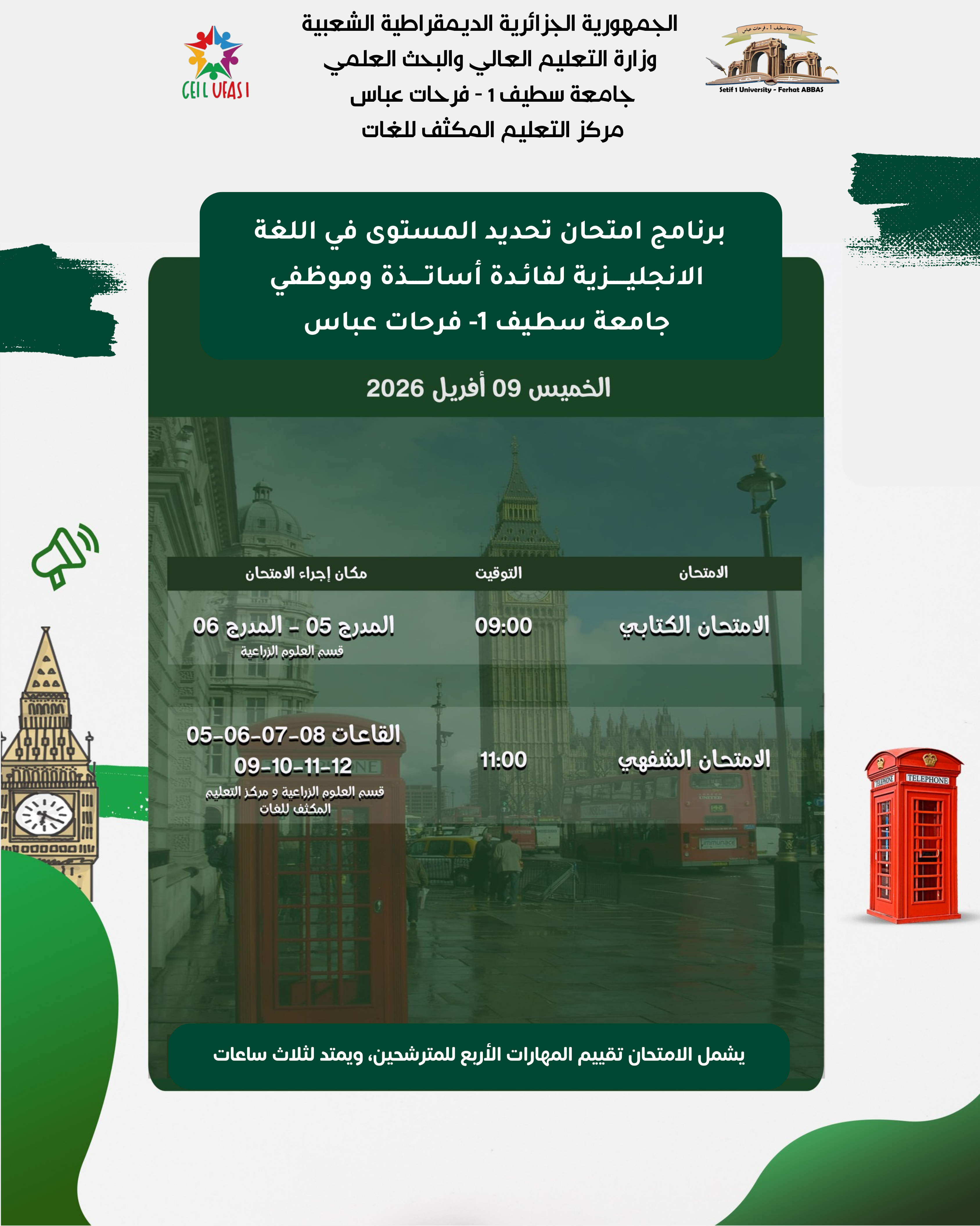 يُعلن مركز التعليم المكثف للغات بجامعة سطيف 1 – فرحات عباس كافة الأساتذة والموظفين المسجلين في برنامج الحركية الدولية في إطار تحسين اللغة الإنجليزية، عن تنظيم إمتحان تحديد المستوى في اللغة الانجليزية .