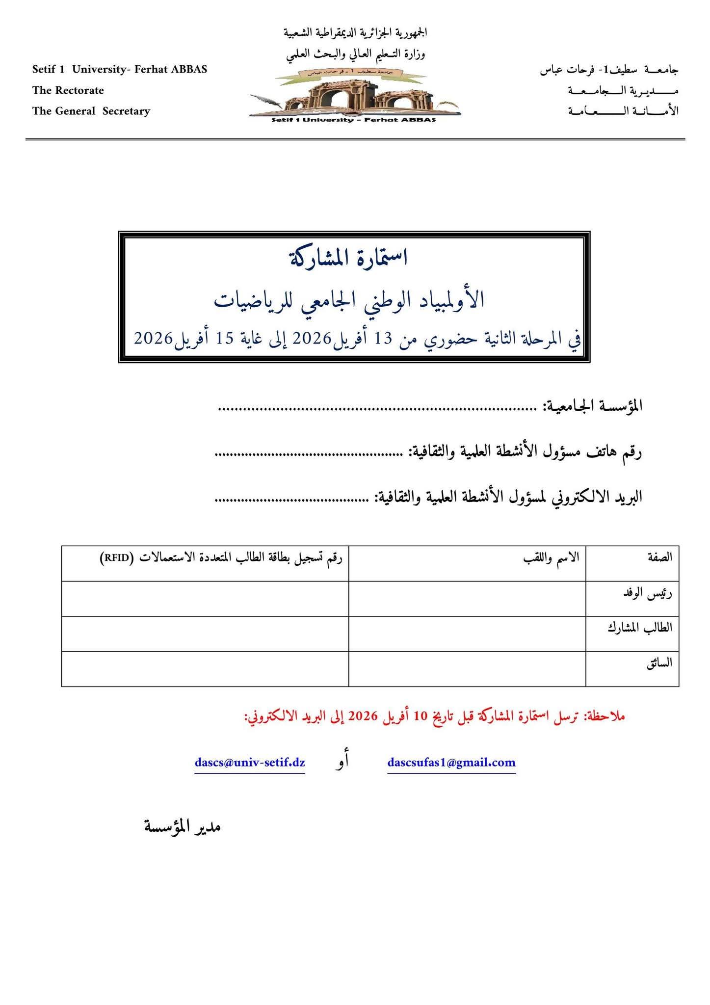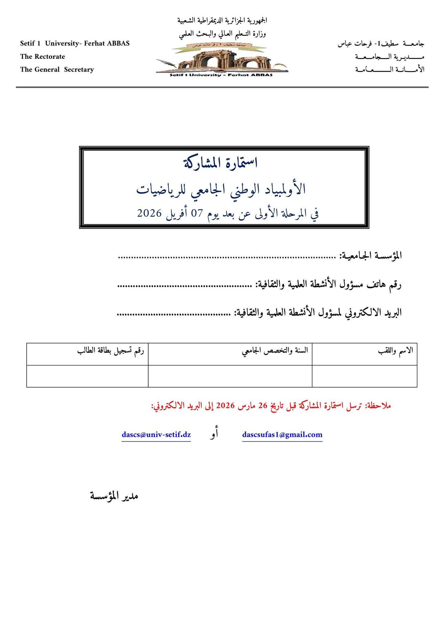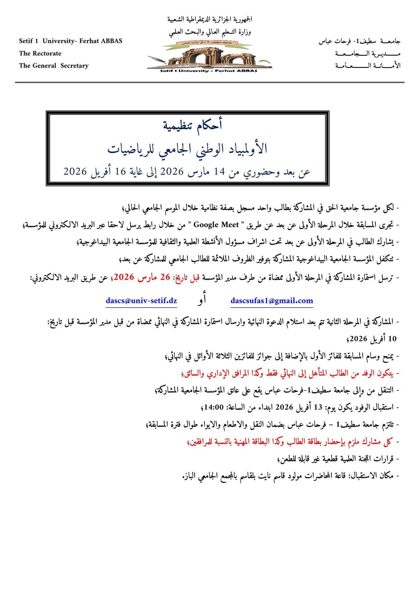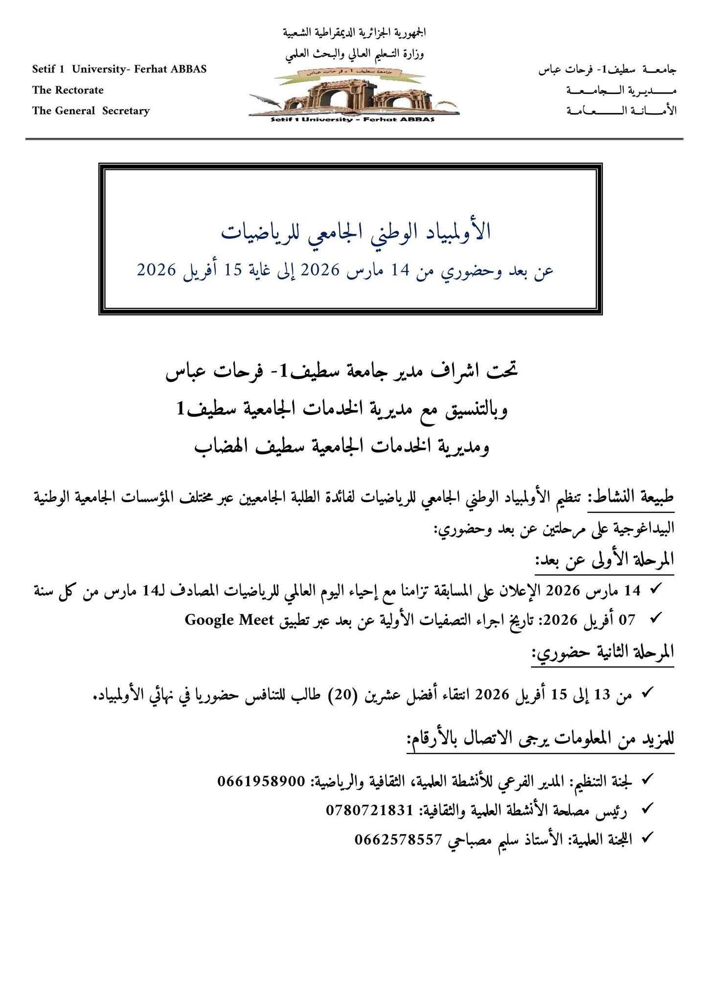بمناسبة إحياء اليوم العالمي للرياضيات المصادف لـ 14 مارس من كل سنة، تنظم جامعة سطيف 1- فرحات عباس خلال الفترة من 14 مارس إلى 15 أفريل 2026، الطبعة الثانية للأولمبياد الوطني الجامعي للرياضيات بالتنـسيق مع مديرية الخدمات الجامعية سطيف ومديرية الخدمات الجامعية سطيف 2 - الهضاب.