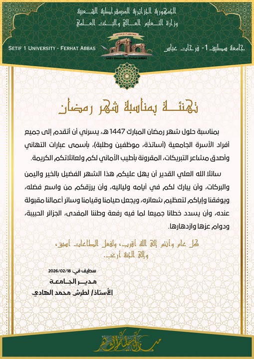 بمناسبة حلول شهر رمضان الفضيل، يتقدم السيد مدير جامعة فرحات عباس سطيف 1، الأستاذ محمد الهادي لطرش، بأحر التهاني وأصدق الأماني لكافة أفراد الأسرة الجامعية من أساتذة، وموظفين إداريين وتقنيين، وطلبة.